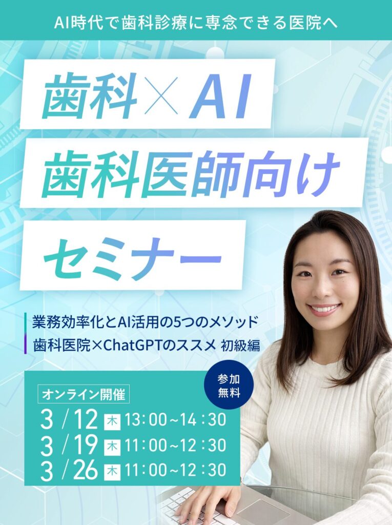 | 概要 | 【歯科医師向けセミナー】 AI時代で歯科診療に専念できる医院へ 業務効率化とAI活用の5つのメソッド 歯科医院×ChatGPTのススメ<初級編> |
